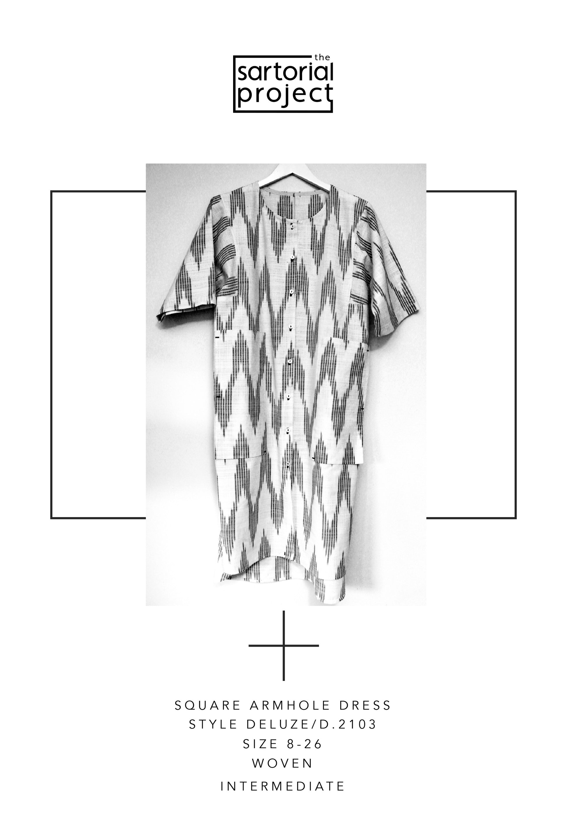 DESCRIPTION: The boxy silhouette of the Deluze square armhole dress features a round bias bound neck edge and a tab opening for buttons at the centre front. The dress has a back and front scooped hem and the pockets are designed to float to add design interest. The sleeves length can be full length to the wrist or adjusted to 3/4 or a shorter for summer wearing. Depending on the weight of the fabric used this dress could also work just as well as a collarless coat for summer or winter. The garment on the cover and included in the step-by-step instructions have been made in 100% cotton fabric.