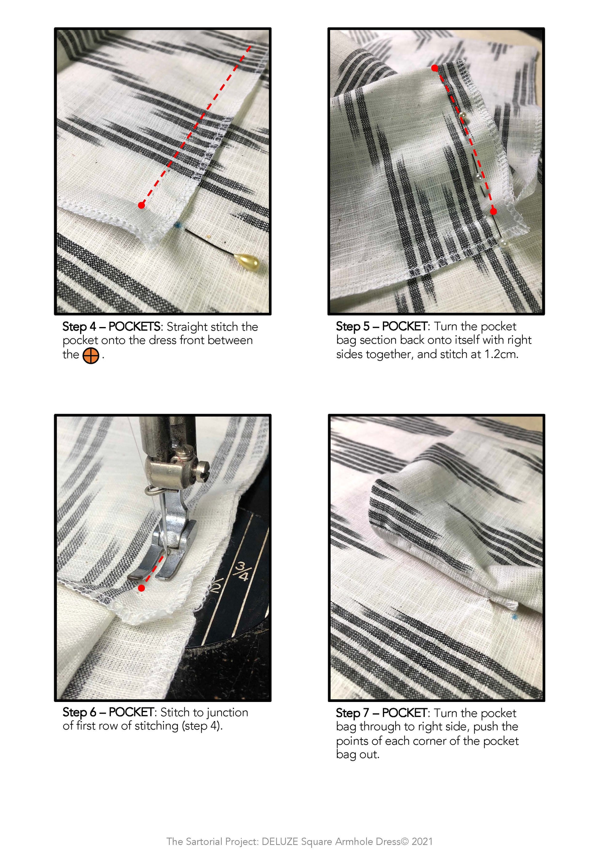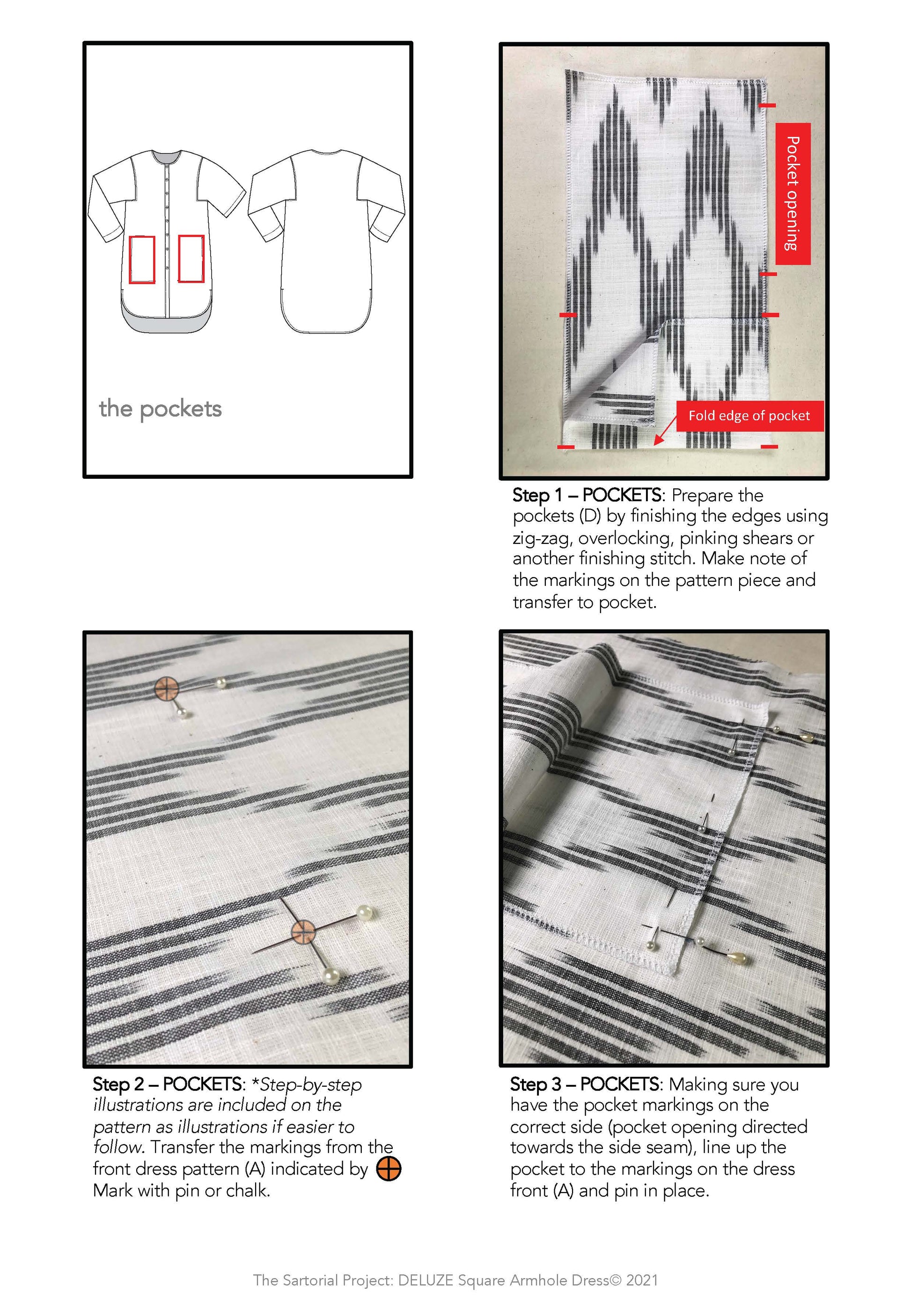 ENHANCING YOUR SEWING SKILLS: This pattern will help you gain new skills in sewing non-conventional pockets and square armholes. You can also add your own decorative finishes on the dress such as bar-tack details for a personalised finish.