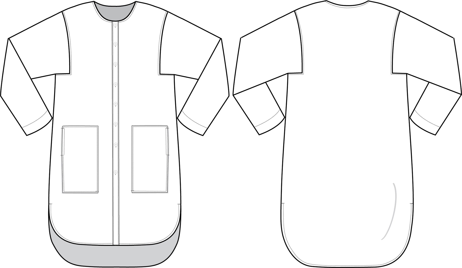 ALTERATIONS TO THE PATTERN: This garment can be shortened and worn as a top, or shorter style dress or coat. To make the top – consider eliminating the pockets depending on the final length of the garment. Purchase fabric once you have adjusted the length to your personal preference.