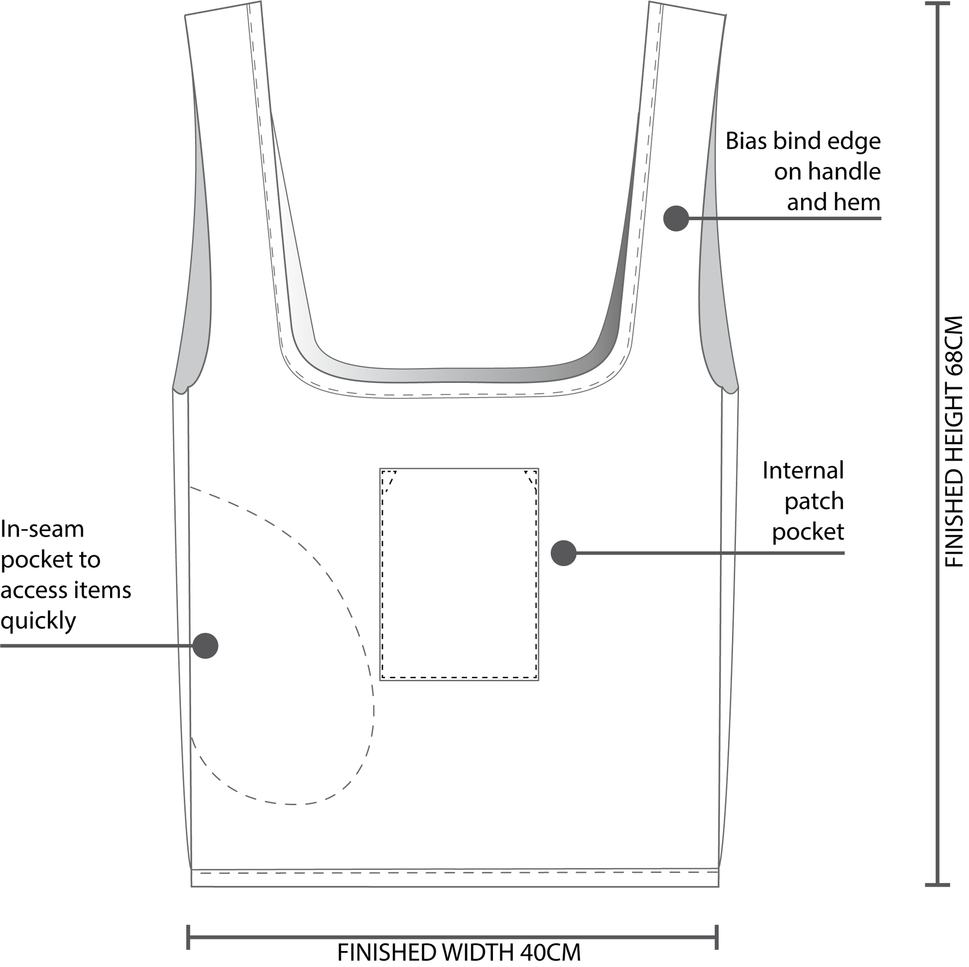 SUITABLE FABRICS: Cotton Poplin, Linen, Cotton/Linen blends, Chambray, denim or stable mid-weight woven fabrics. As a up-cycle option, leftover fabrics can be pieced together to make this bag.